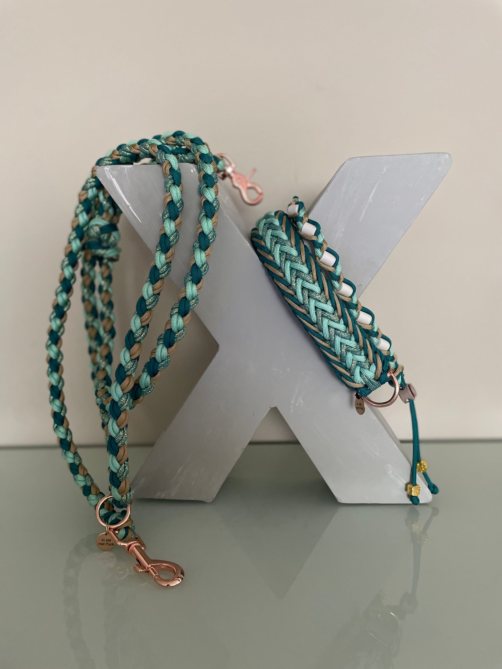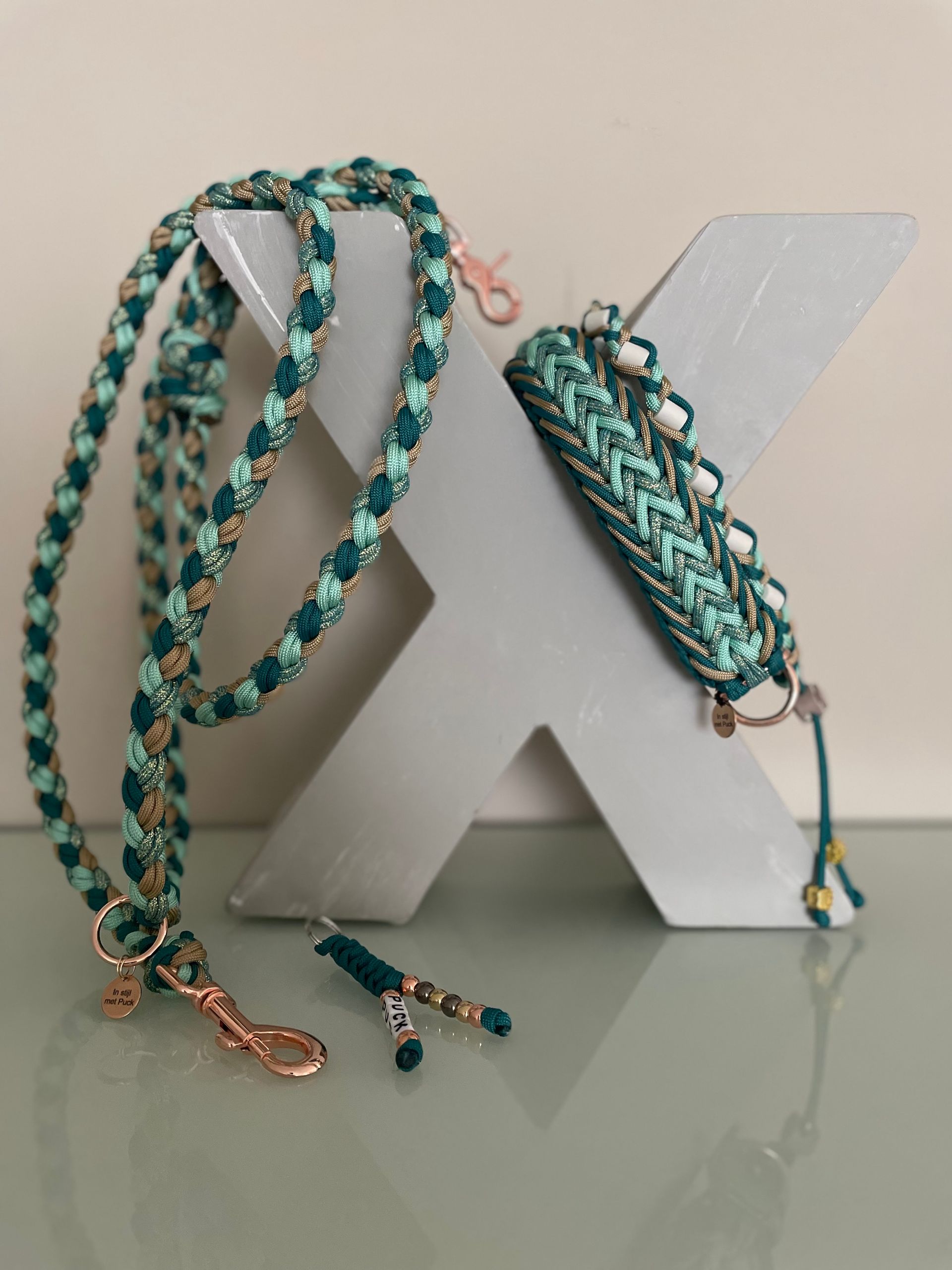 Ontdek de Emerald Wave hondenhalsband, een unieke, stijlvolle en comfortabele halsband is de prachtige kleuren: teal, mocca, pastel blauw en shiny ice. Deze luxe halsband heeft een teal- rose gouden adapter en heeft een stevige breedte van 3,5 cm.