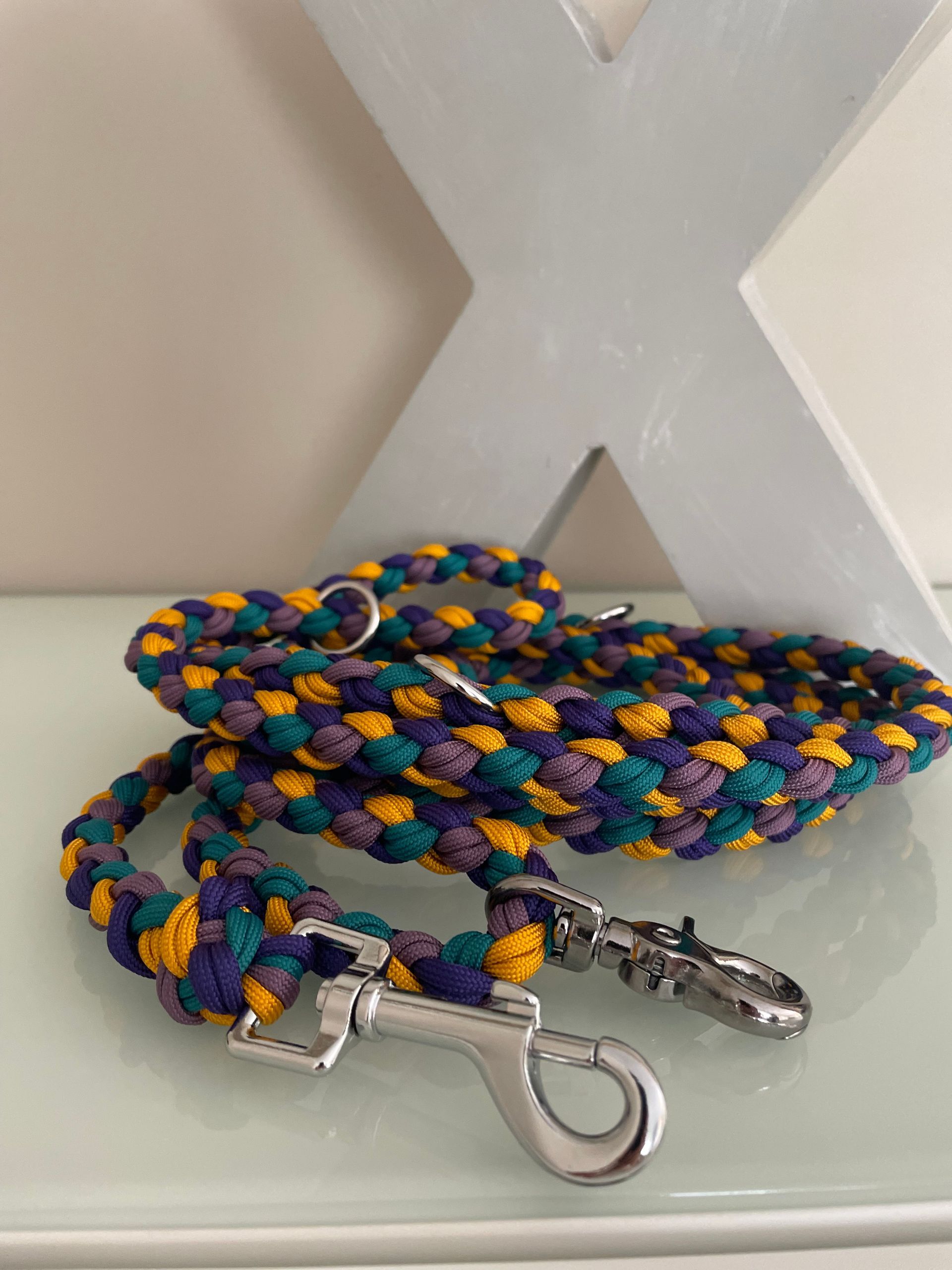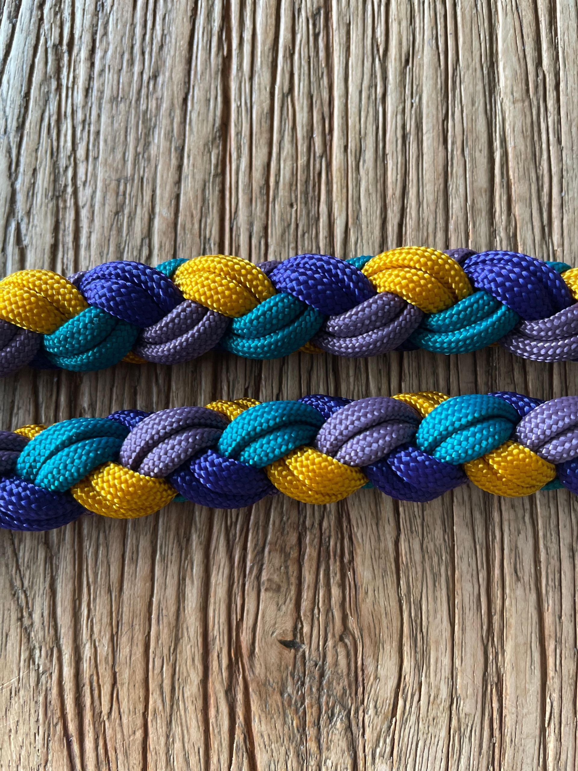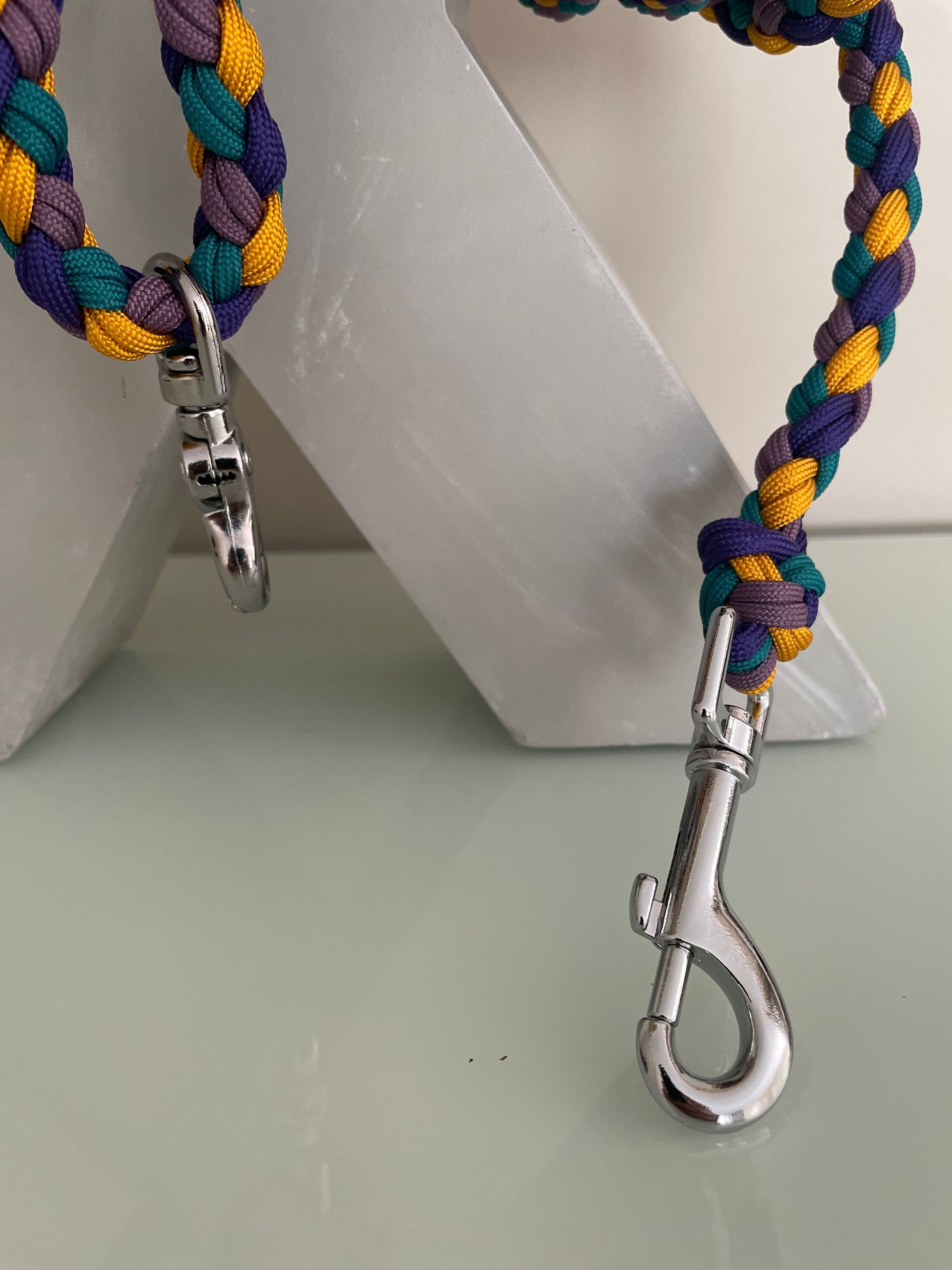 Ontdek de riem Magic Forest gemaakt van paracord type 3. Een unieke, stijlvolle en comfortabele riem die prettig in de hand ligt.Deze luxe riem heeft de volgende kleuren: golden rod, royal paars, teal en marcelous mauve, en is beschikbaar in diverse lengtes. De riem heeft een zilverkleurige musketon qua afwerking.