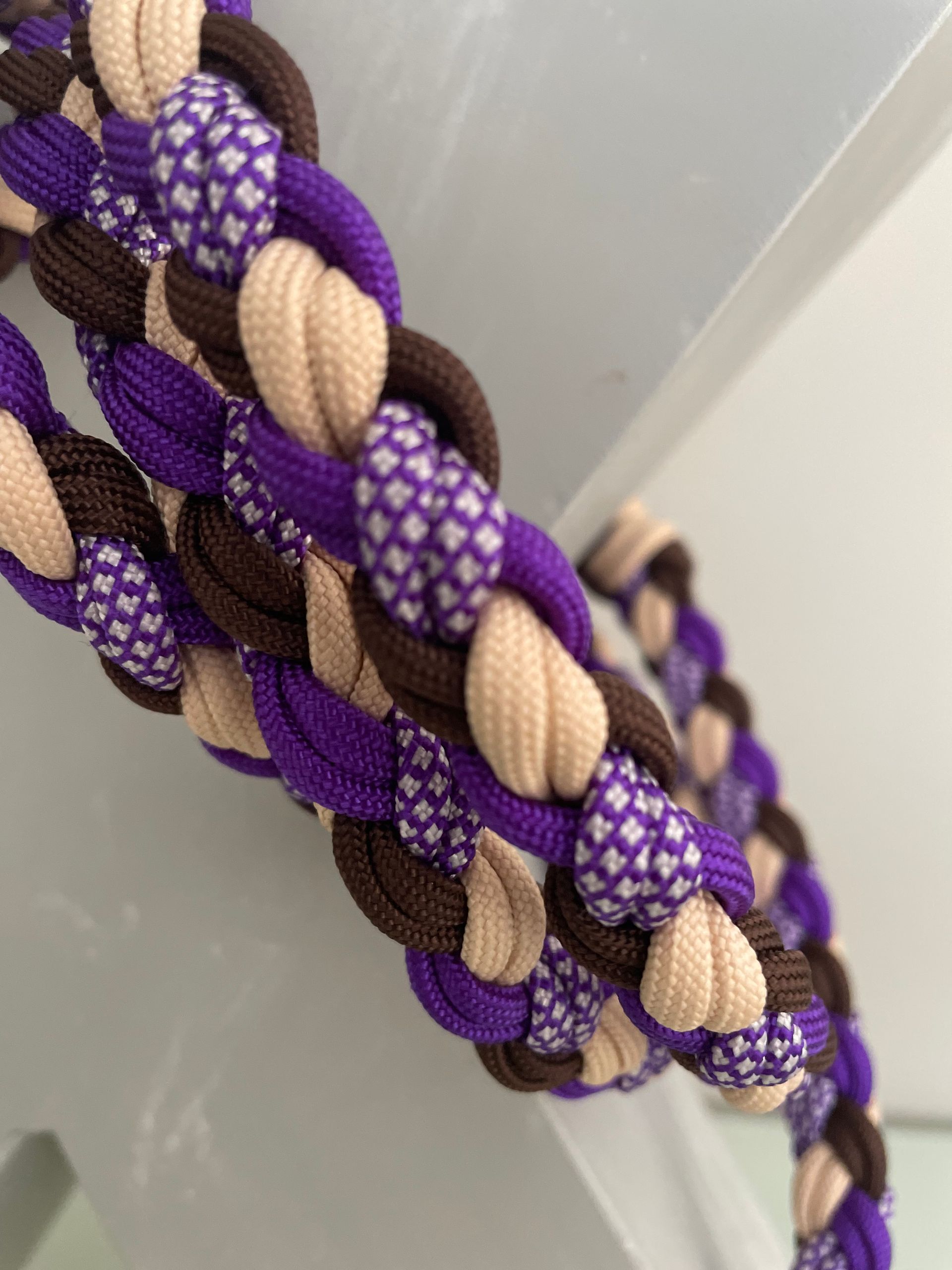 Ontdek de riem Royal Twist gemaakt van paracord type 3. Een unieke, stijlvolle en comfortabele riem die prettig in de hand ligt.Deze luxe riem heeft de volgende kleuren: linnen, walnut bruin, acid paars en acid paars cream diamond en is beschikbaar in diverse lengtes. De riem heeft een zilveren musketon qua afwerking.