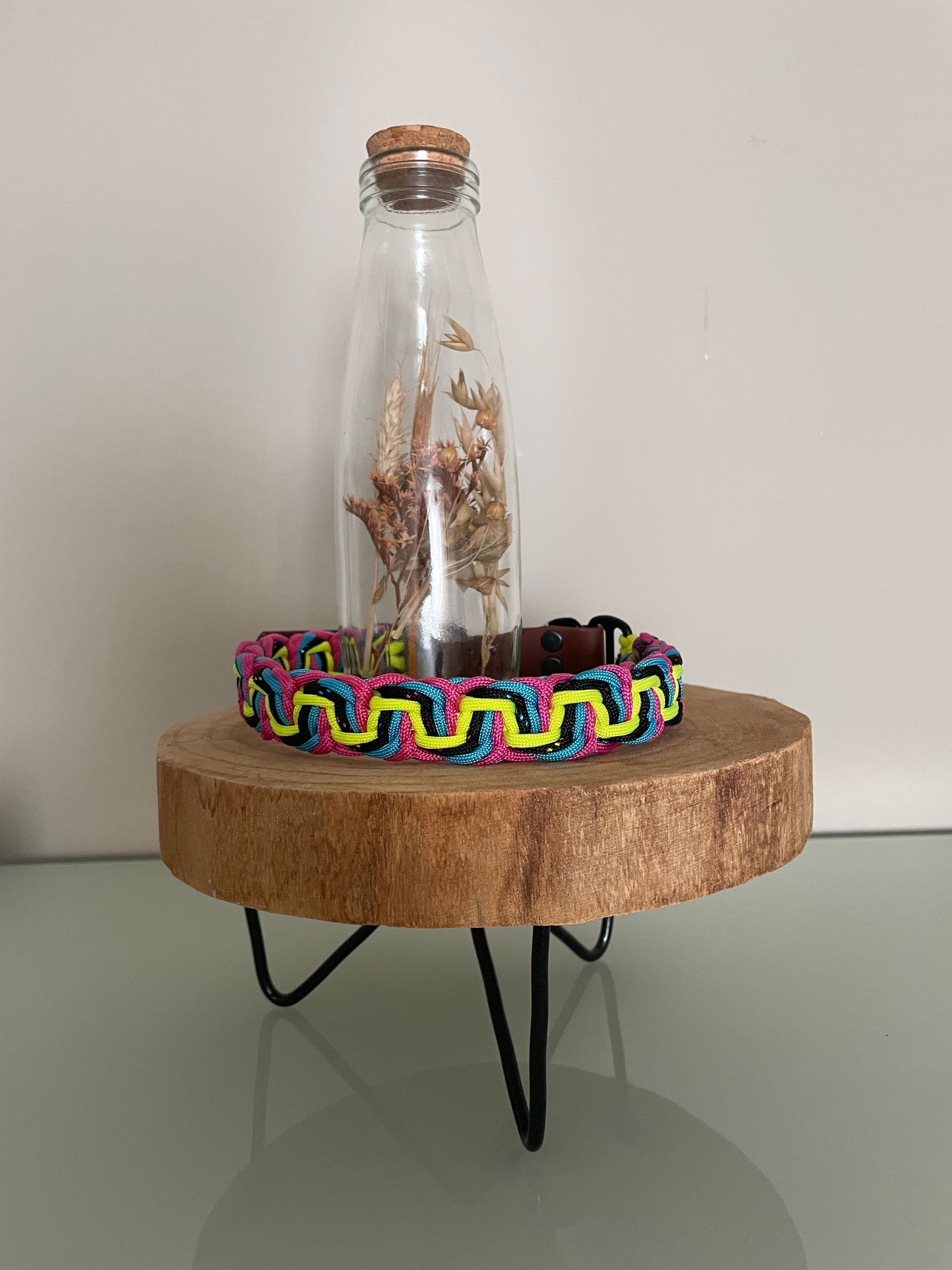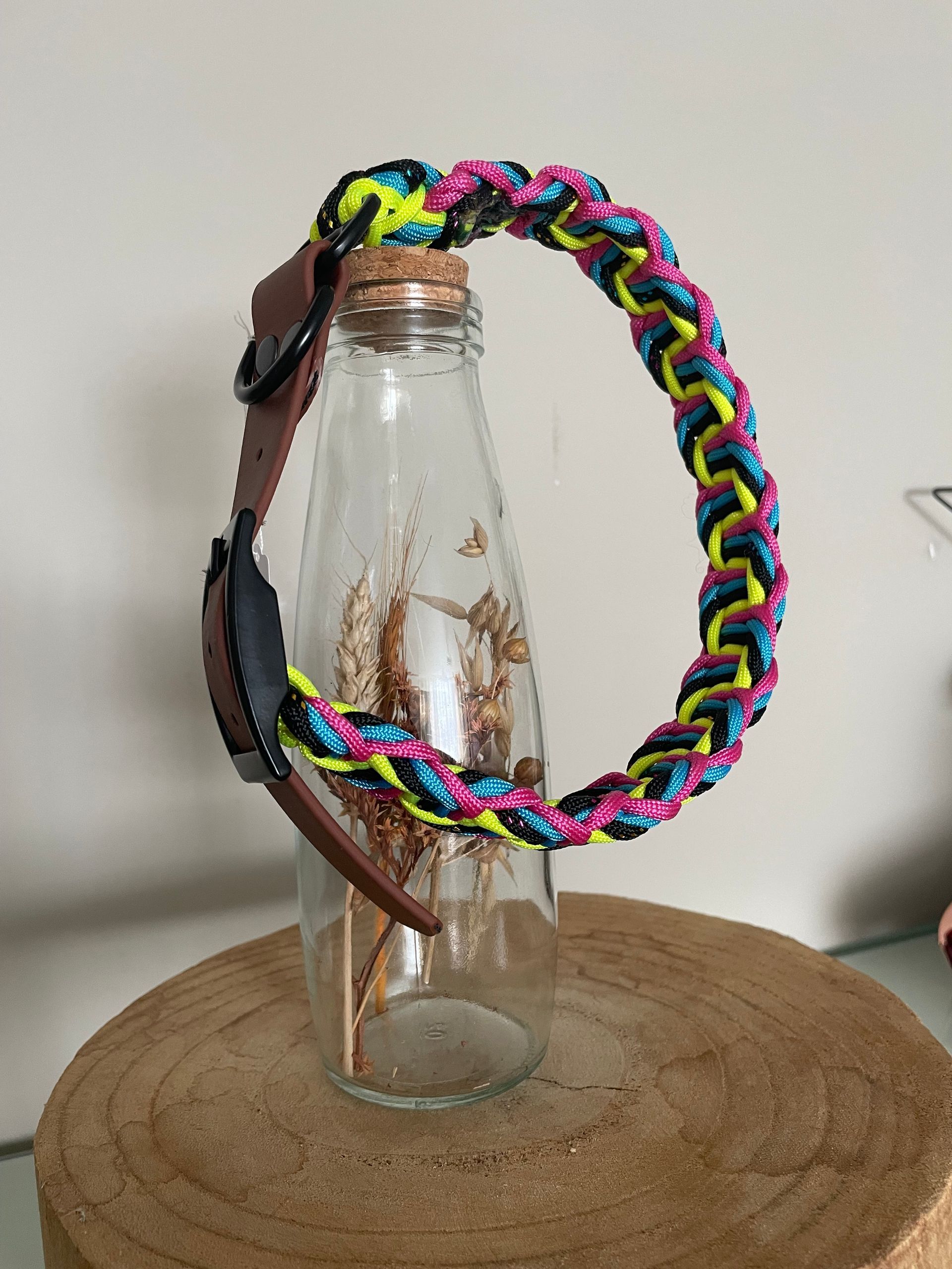 Ontdek de Colourfull Joy hondenhalsband, een stijlvolle en comfortabele halsband in de prachtige kleuren:zwart sparkle, neon geel, roze en baby blauw. Deze luxe halsband heeft een midden bruine- mat zwarte adapter en heeft een stevige breedte van 2,5 cm.