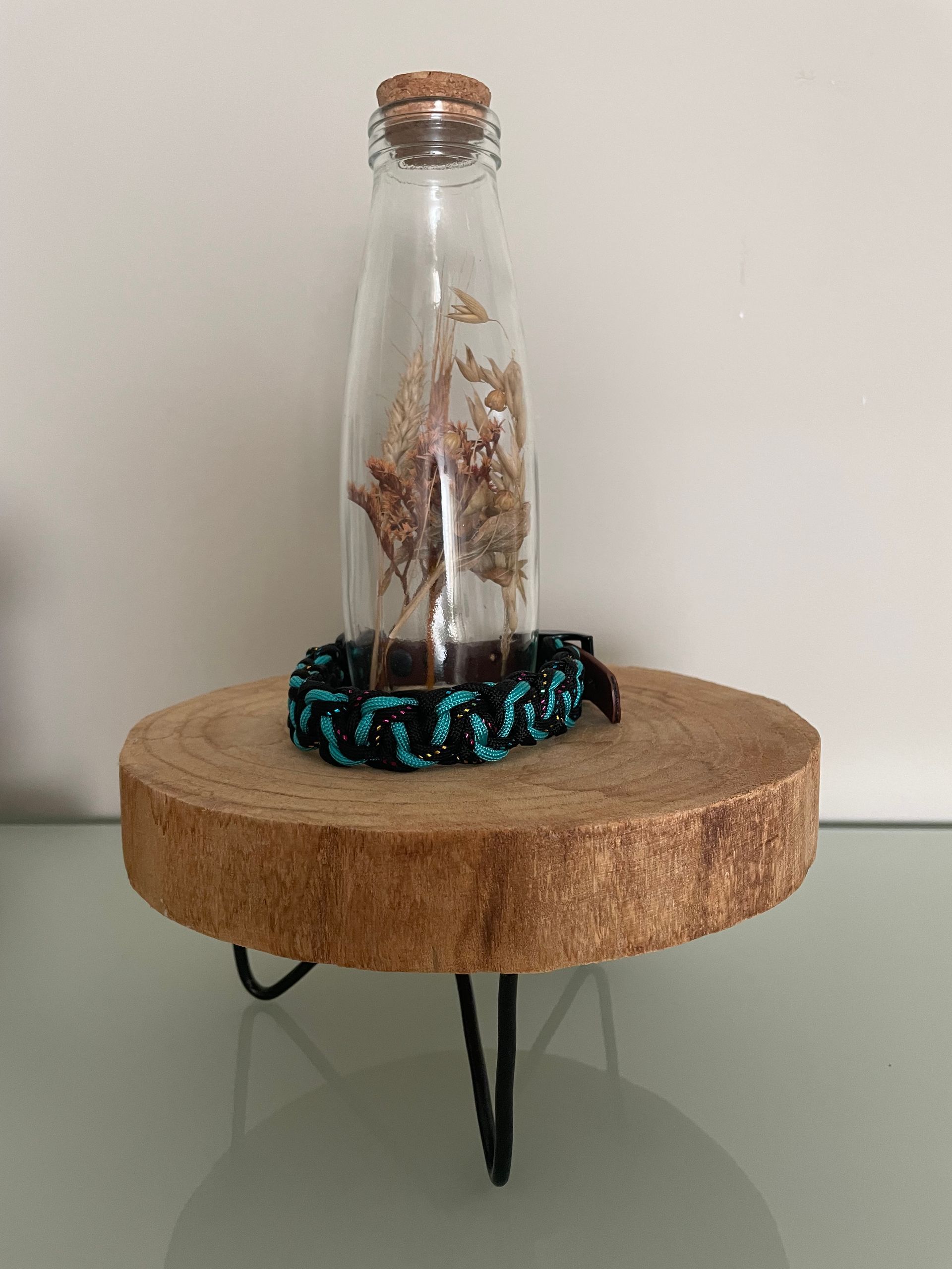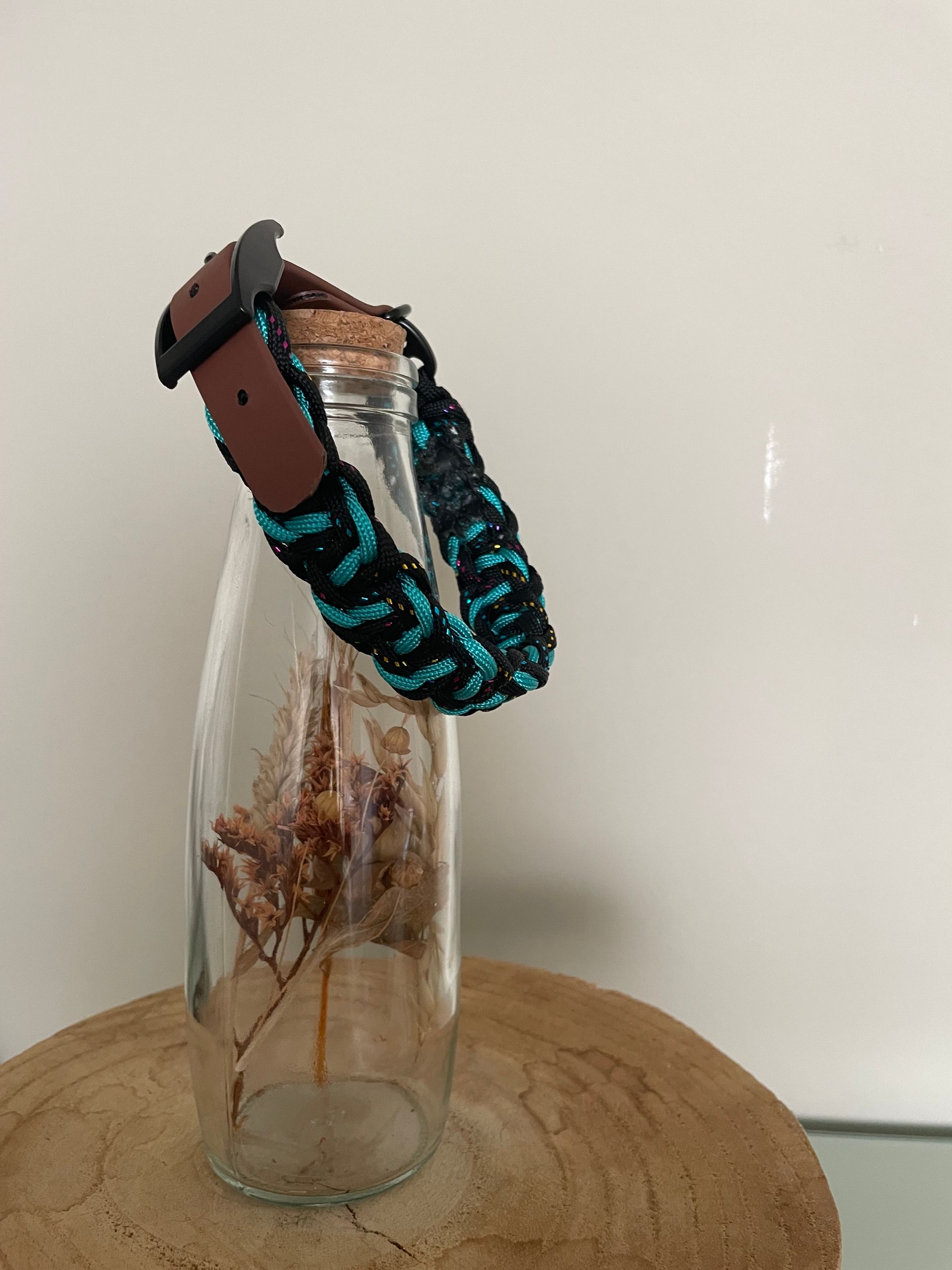 Ontdek de Colourfull Joy hondenhalsband voor de kleine tot middengrote hond! Een unieke, stijlvolle en comfortabele halsband in de prachtige kleuren: zwart sparkle en neon turquoise. Deze halsband heeft een midden bruine- mat zwarte adapter en een stevige breedte van 2 cm.