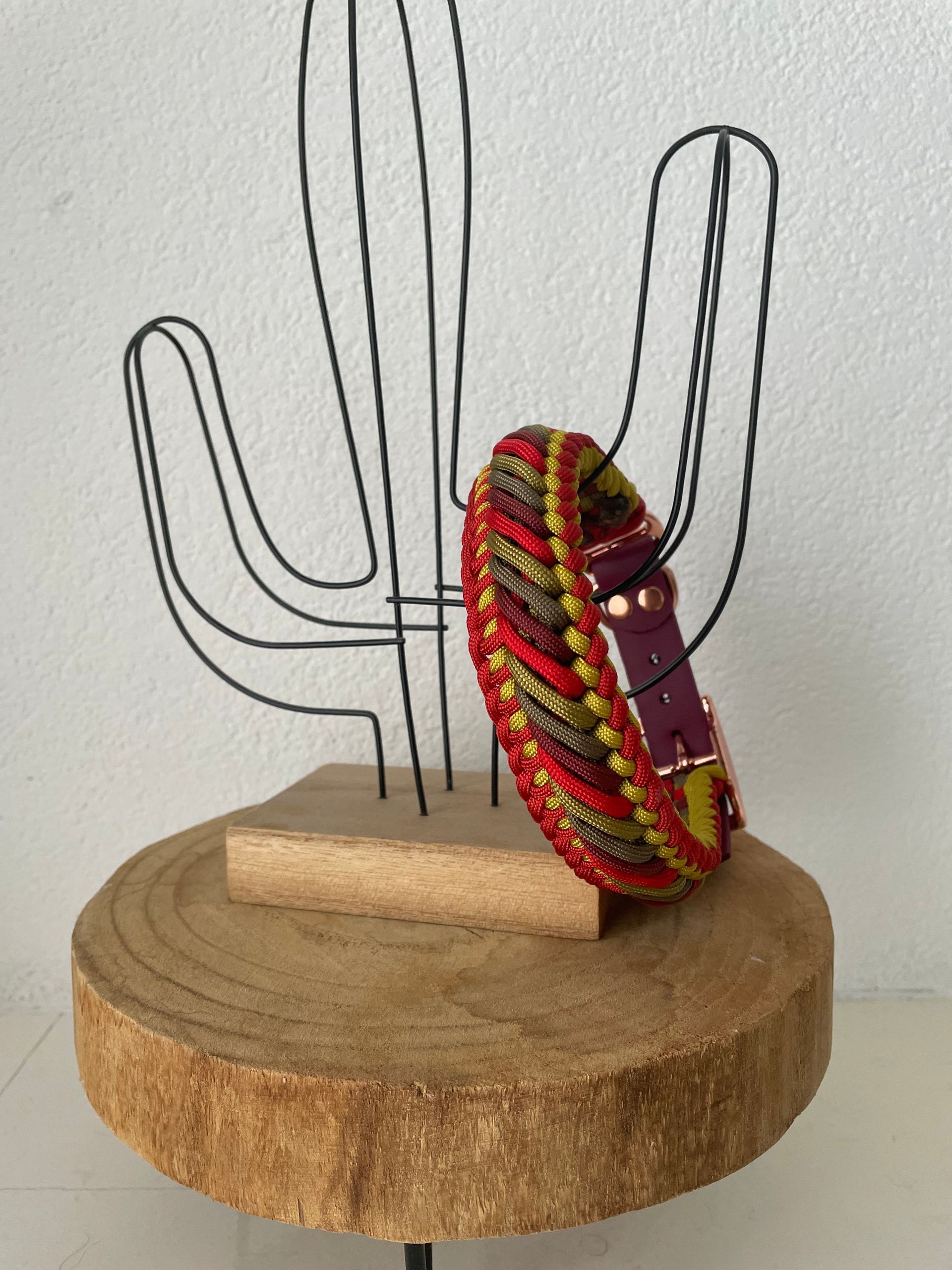 Ontdek de Firework Fiesta hondenhalsband, een stijlvolle en comfortabele halsband in de prachtige kleuren: poppyrood, oker geel, viva la vino, olive drab en holy guacamole . Deze luxe halsband heeft een wijnrode- rose gouden adapter en heeft een stevige breedte van 3,5 cm.