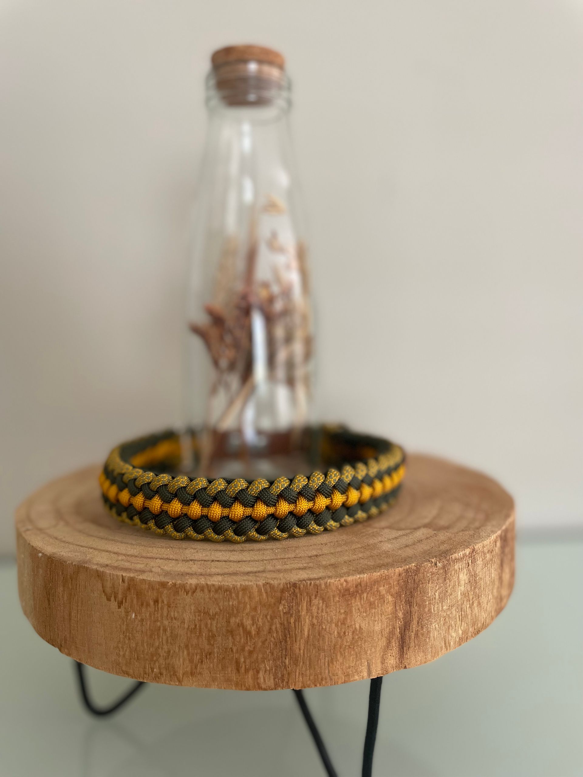 Ontdek de Autum Glow hondenhalsband voor de kleine tot middengrote hond! Een unieke, stijlvolle en comfortabele halsband in de prachtige kleuren: army groen, golden rod en golden rod diamond. Deze halsband heeft een cognac- zilveren adapter en een stevige breedte van 2,5 cm.