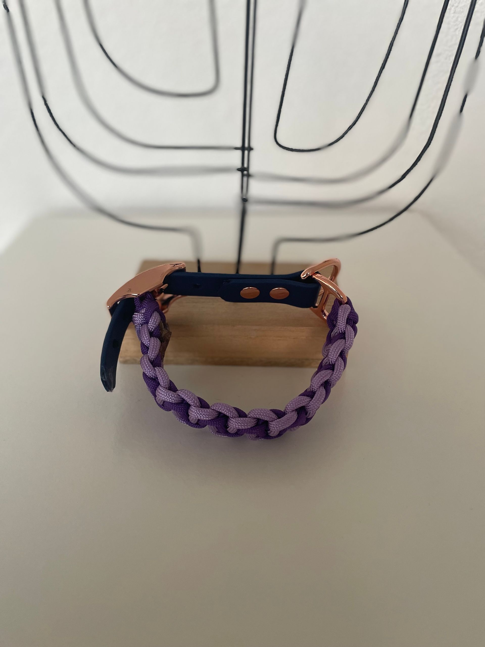 Ontdek de magie van de avondschemering met de hondenhalsband Twillight Glow. Geschikt voor de kleine tot middengrote hond! Een unieke, stijlvolle en comfortabele halsband in donkere, diepe kleuren die warmte uitstralen: royal paars en lilac. Deze halsband heeft een donkerblauwe- rose gouden adapter en een stevige breedte van 2 cm.