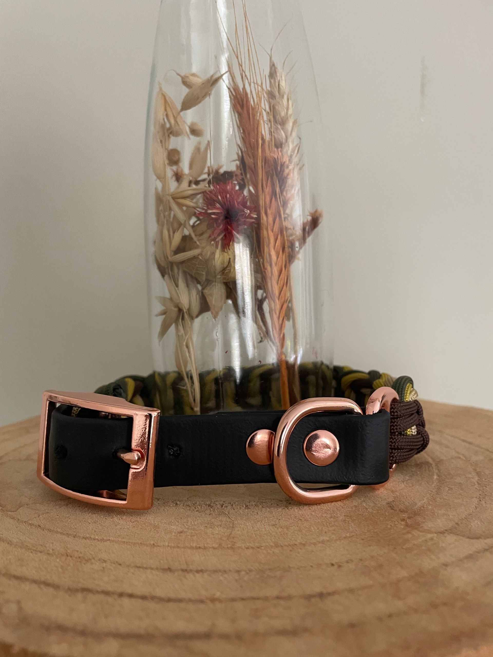 Ontdek de stoere Woodland Trail hondenhalsband voor de kleine tot middengrote hond! Een unieke, stijlvolle en comfortabele halsband in aardse camouflagekleuren: walnut bruin, army groen, oker geel en goud. Deze halsband heeft een zwart- rose gouden adapter en een stevige breedte van 2,5 cm.