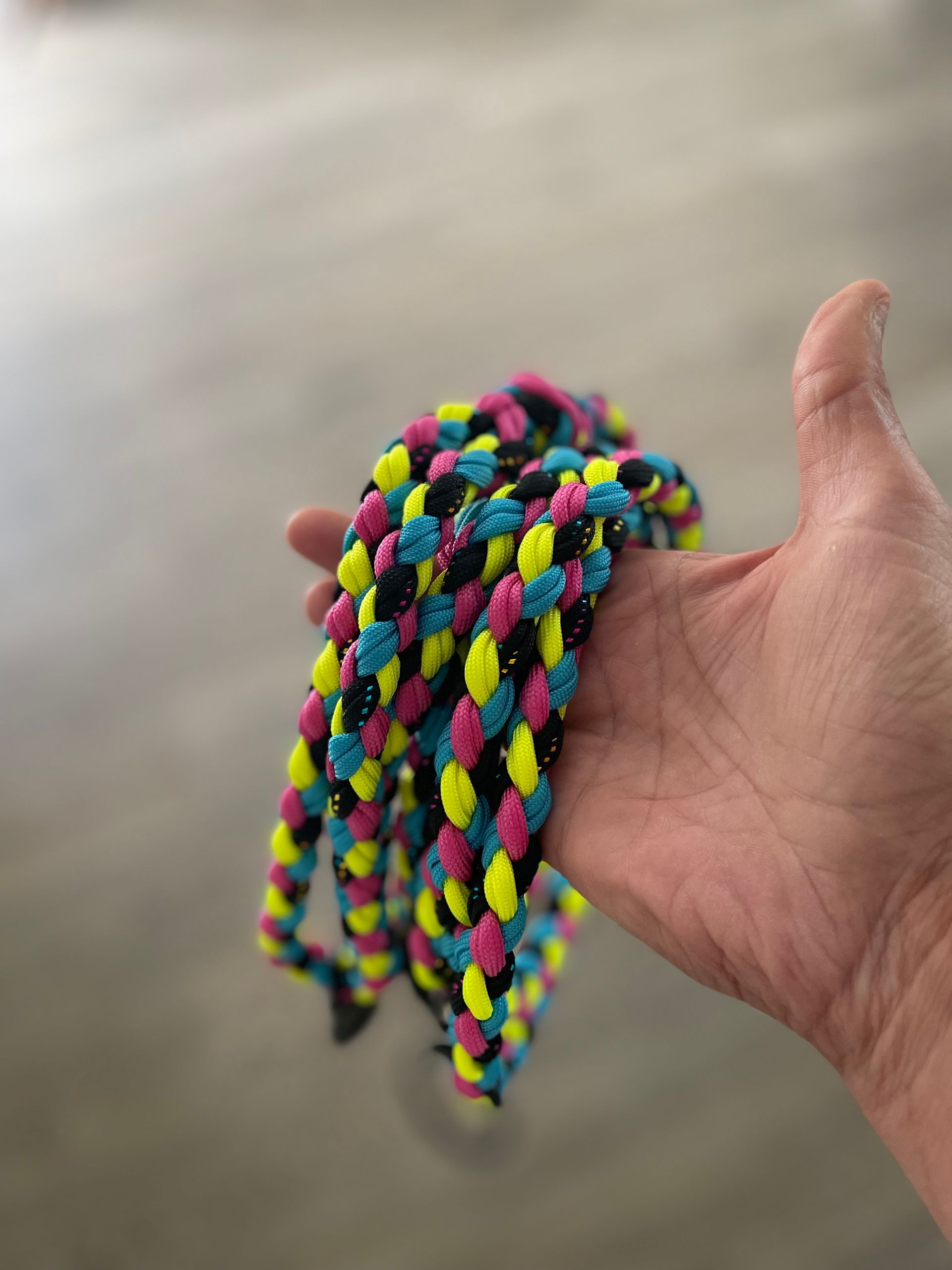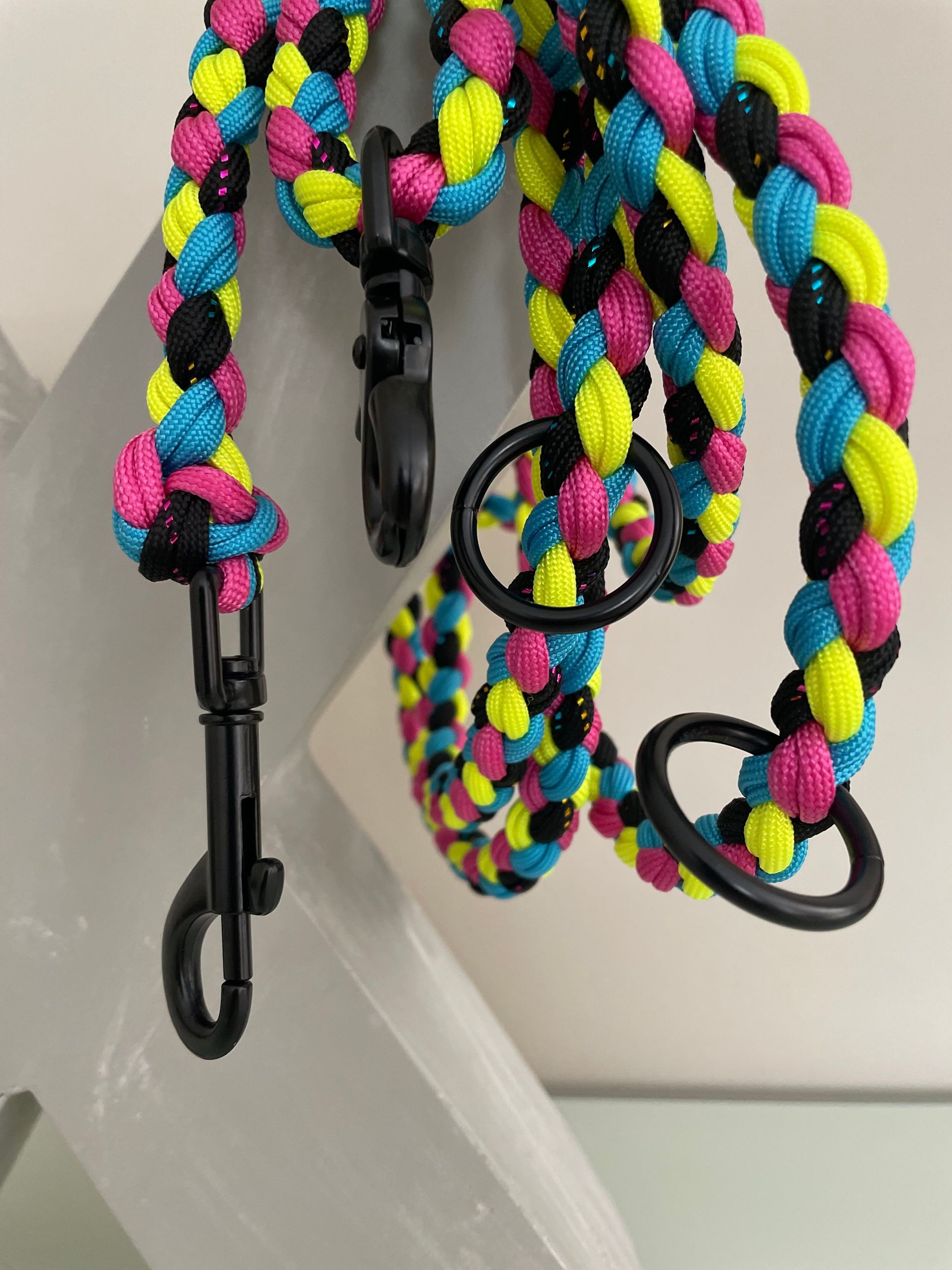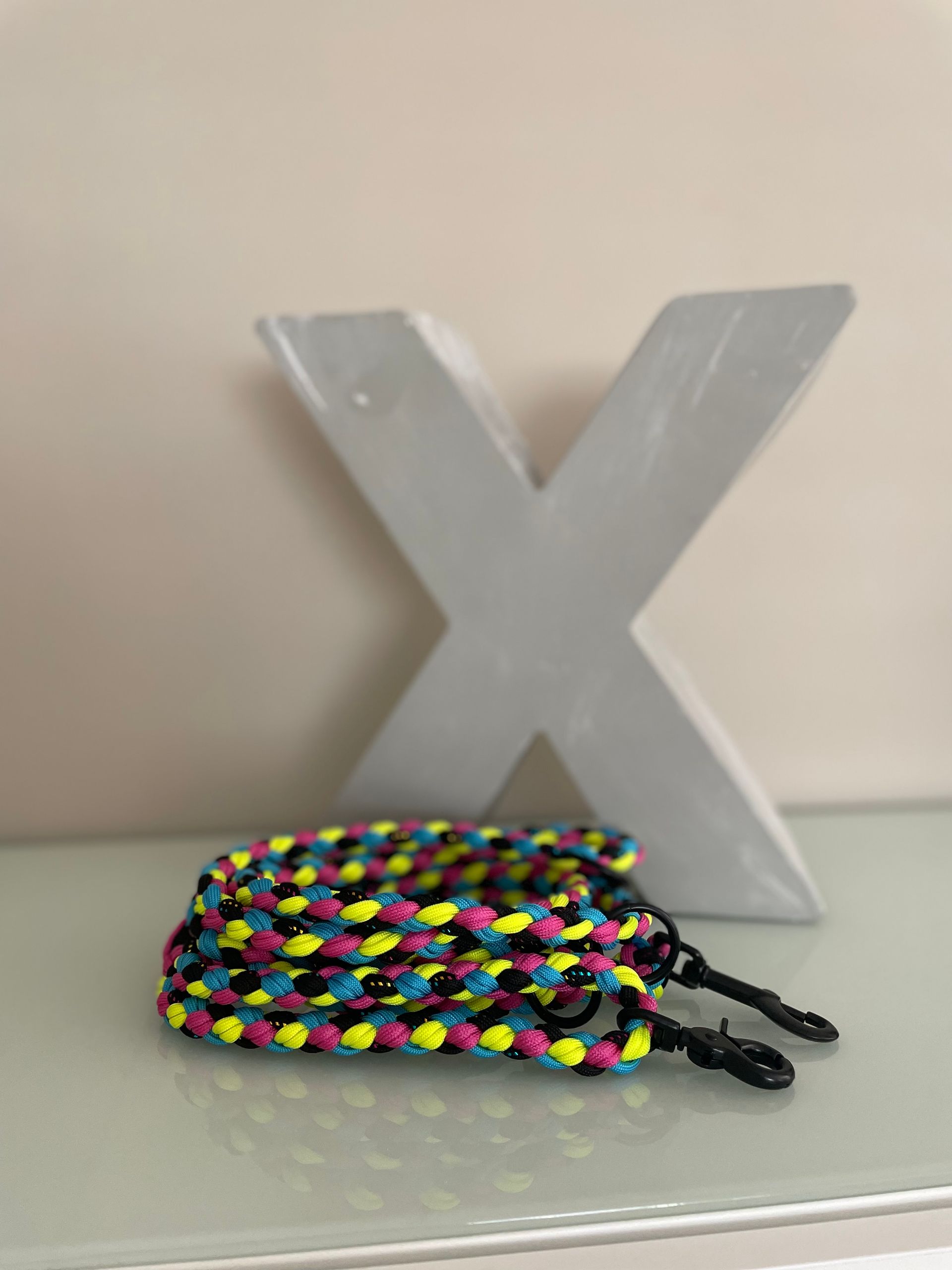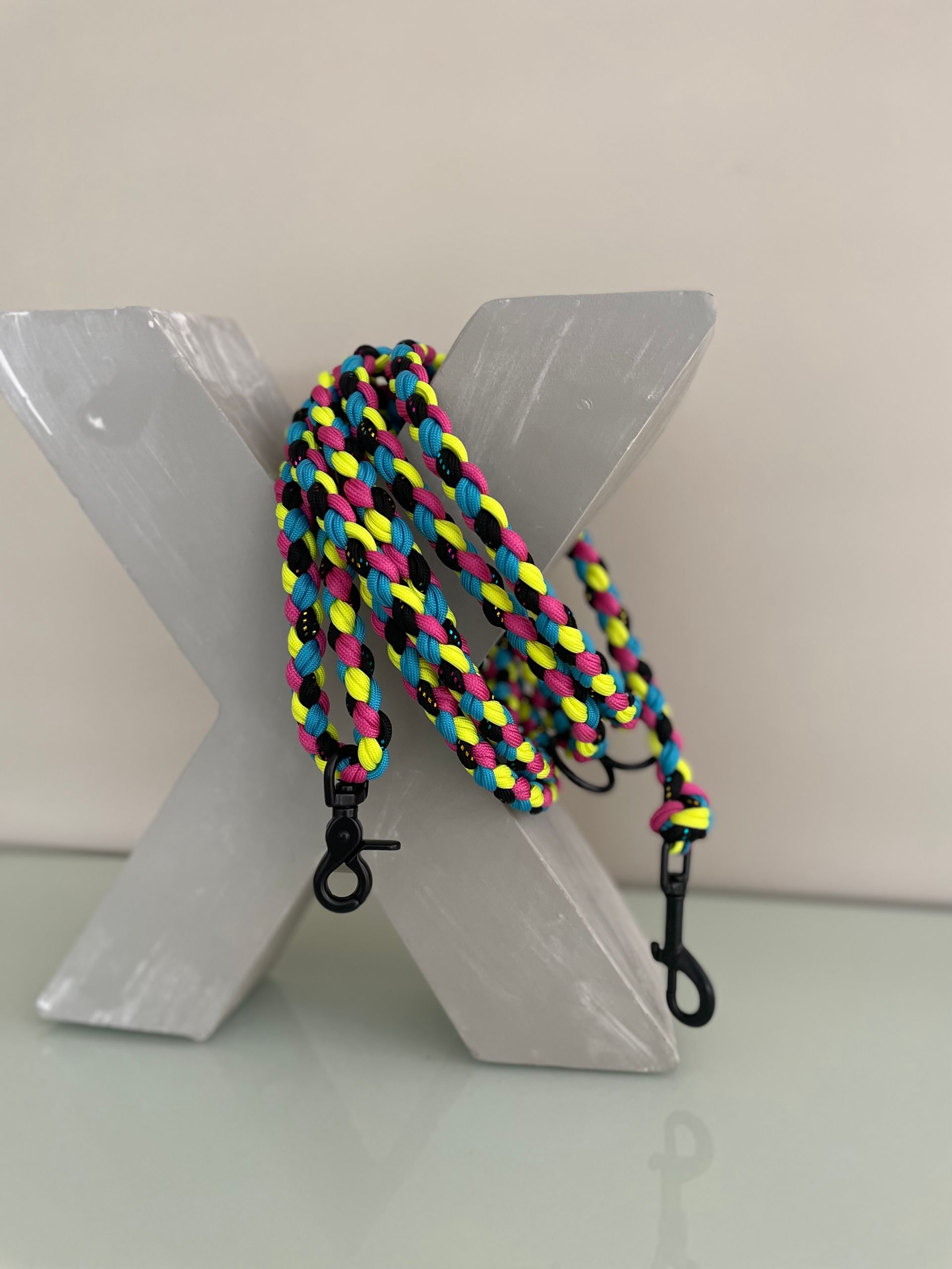 Ontdek de riem Disco Fever gemaakt van paracord type 3. Een unieke, stijlvolle en comfortabele riem die prettig in de hand ligt.Deze luxe riem heeft de volgende kleuren: zwart sparkle, neon geel, roze en baby blauw, en is beschikbaar in diverse lengtes. De riem heeft een mat zwarte musketon qua afwerking.