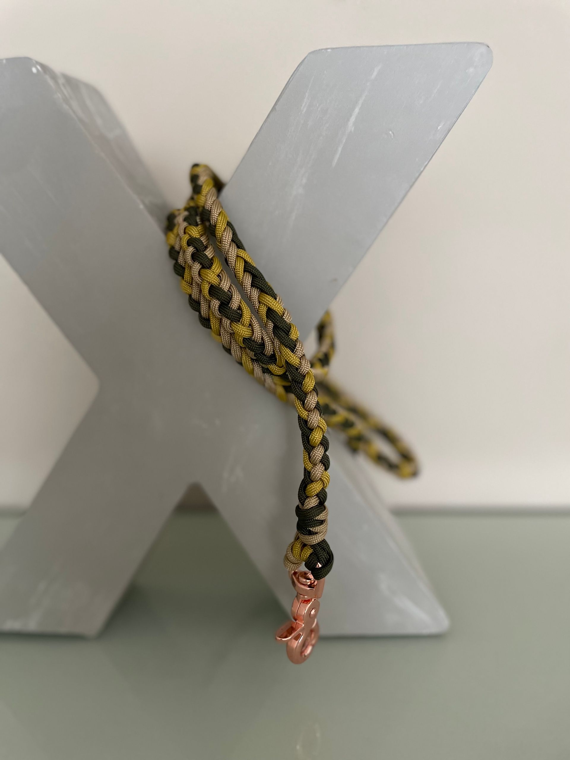 Ontdek de riem Savanna Spirit mini gemaakt van 3 kleuren paracord type 3. Een unieke, stijlvolle en comfortabele riem die prettig in de hand ligt geschikt voor gebruik kleine tot middengrote hond.Deze luxe riem heeft de volgende kleuren: army groen, oker geel en goud, en is beschikbaar in diverse lengtes. De riem heeft een mat rose gouden musketon qua afwerking.
